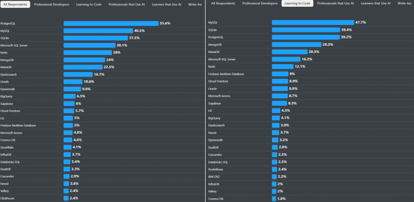 К числу популярных баз данных в этом году стоит отнести PostgreSQL, MySQL, SQLite, Microsoft SQL Server и Redis. Как и в случае выше, по базам данных указанная пятерка остается востребована среди профессионалов, однако для обучения чаще применяют базы данных MySQL, SQLite, PostgreSQL, MongoDB и MariaDB.