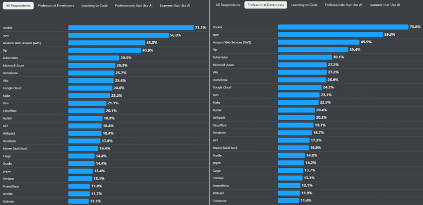 По технологиям для облачной разработки в этом году больше голосовали за Docker, npm, Amazon Web Services (AWS), Pip, Kubernetes и Microsoft Azure. Среди профессионалов ранжирование технологий аналогично, однако среди тех, кто все еще учится, более востребованы npm, Docker, Pip, Make и Cargo.