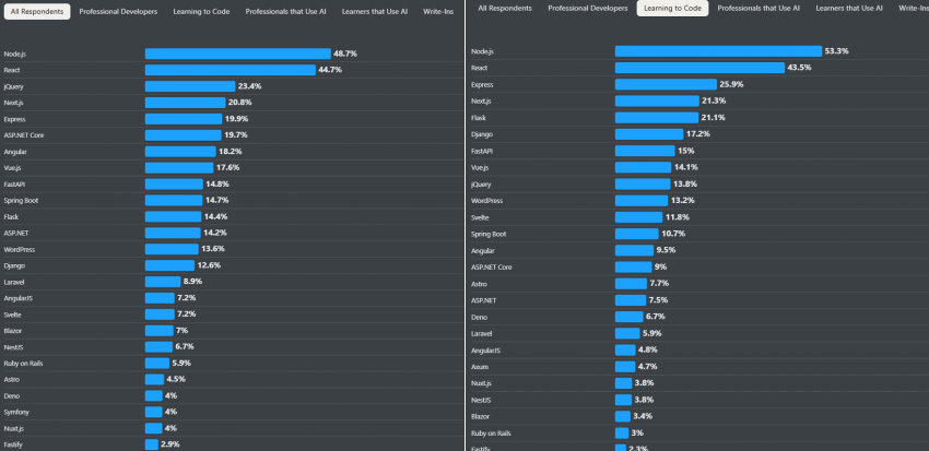 По веб-фреймворкам в этом году лидируют Node.js, React, jQuery, Next.js и Express. У профи вместо Express на 5 месте расположилась платформа ASP.NET Core. У новичков Node.js и React сохраняют первую и вторую позицию соответственно, но за ними идут Express, Next.js, Flask и Django.