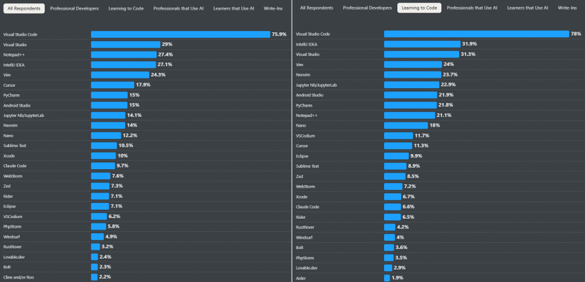 По интегрированным средам популярными в этом году оказались Visual Studio Code, Visual Studio, Notepad++, IntelliJ IDEA и Vim. В рейтинге профессиональных разработчиков Notepad++ и IntelliJ IDEA меняются местами, а среди обучающихся востребованы Visual Studio Code, затем IntelliJ IDEA, Visual Studio, Vim и Neovim.