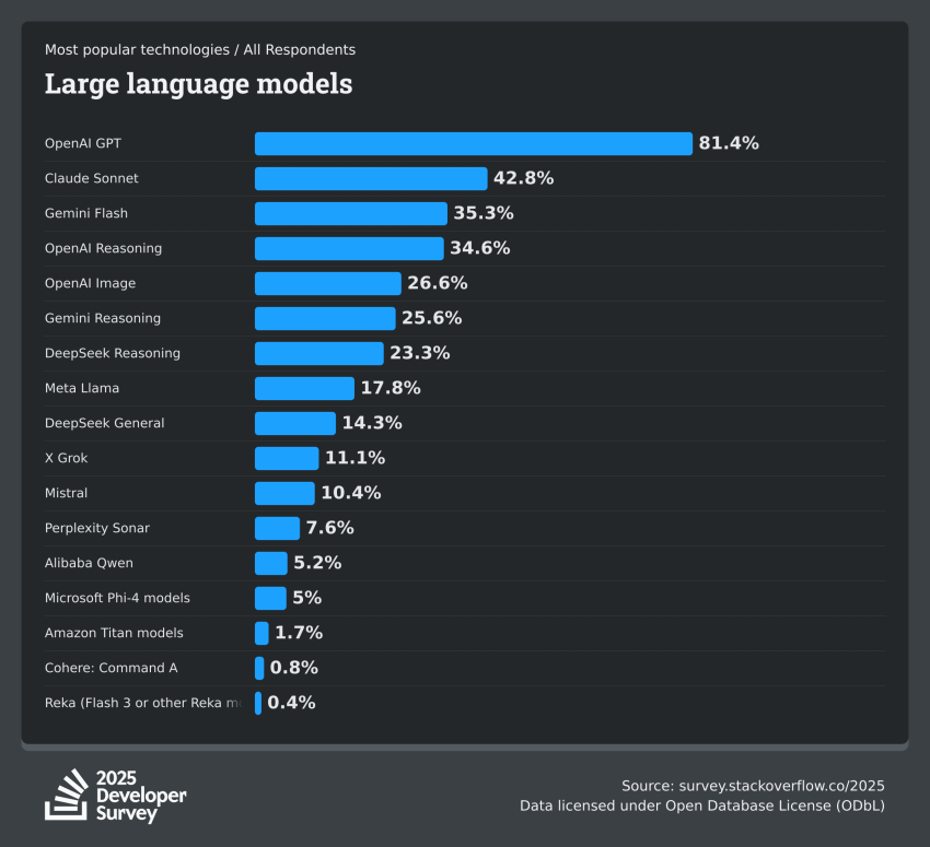 Stack Overflow сохраняет лидирующую позицию в рейтинге комьюнити платформ с 84,2% ответов. За ним идут GitHub, YouTube, Reddit, Stack Exchange и даже Discord. Среди разработчиков наиболее часто используемыми языковыми ИИ-моделями являются GPT от OpenAI, затем Claude Sonnet, Gemini Flash, OpenAI Reasoning и OpenAI Image. К числу инструментов по документации и совместной работы относят GitHub (81,1%), Jira (46,4%) и GitLab (35,6%).