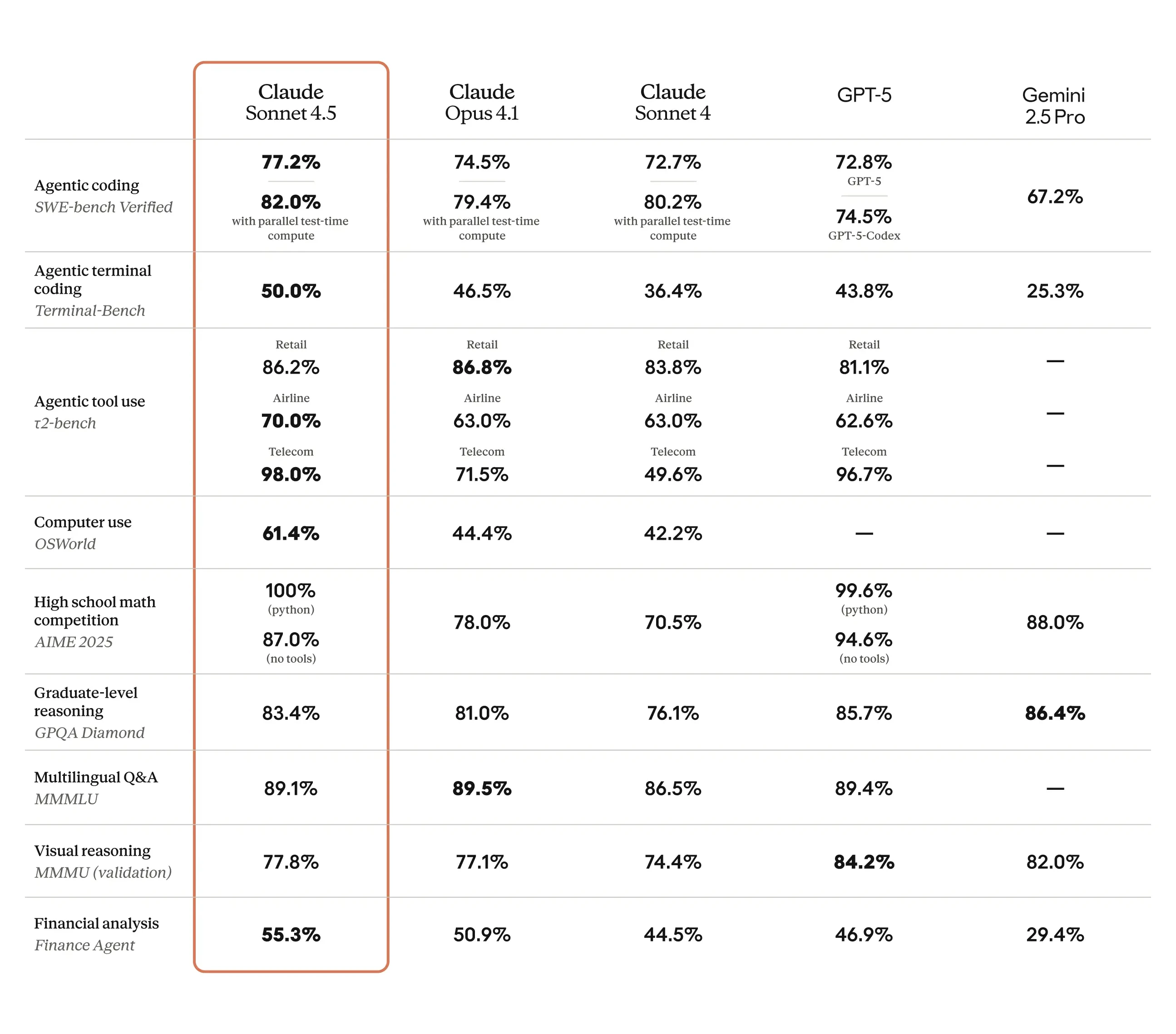 В тесте OSWorld, проверяющем выполнение искусственным интеллектом реальных компьютерных задач, Sonnet 4.5 показал результат 61,4 % против 42,2 % у версии Sonnet 4.