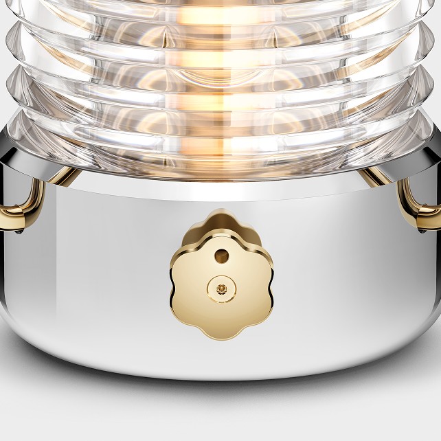 Корпус девайса выполнен из обработанной нержавеющей стали со стеклянным полированным модулем, в котором установлена LED-лампа. По форме светильник схож с традиционными фонарями Френеля. На корпусе есть позолоченный регулятор, вращающийся с тактильными щелчками.