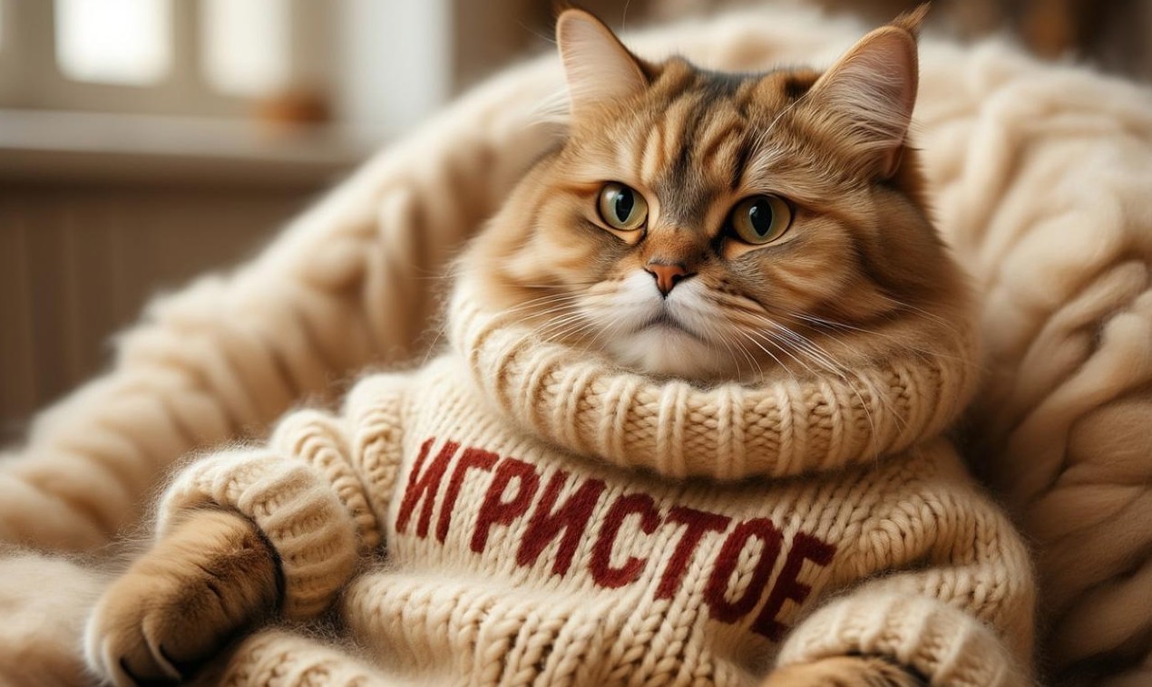 Prompt: Шикарный толстый пушистый кот в вязаном свитере на котором написано ИГРИСТОЕ. Источник: блог Сбера (здесь и далее)