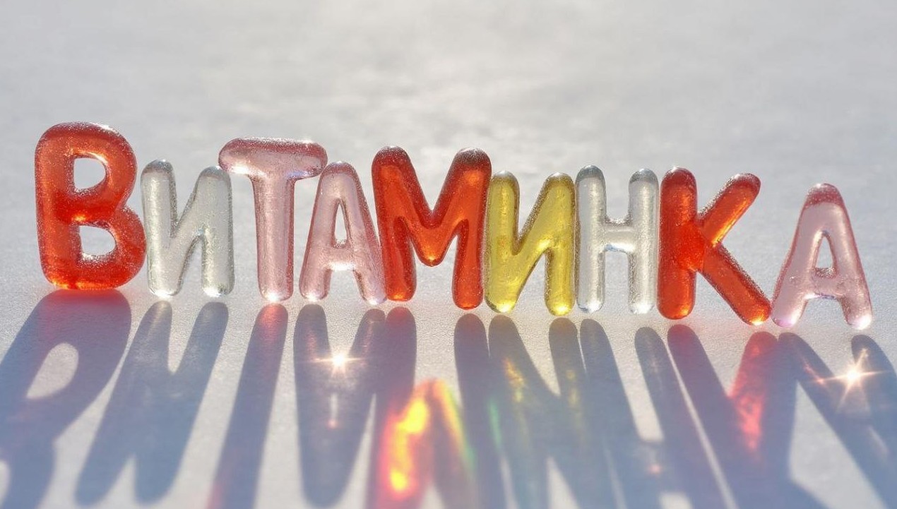 Prompt: На солнечном свету сверкают яркие прозрачные леденцы в виде букв, которые складываются в слово Витаминка. Свет проходит сквозь леденцовые буквы, как сквозь витражи, и оставляет разноцветные отражения на белой глянцевой поверхности. Высокая детализация