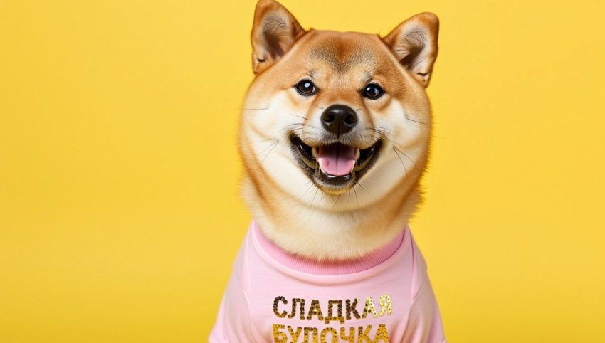 Prompt: Милая улыбающаяся сиба-ину на насыщенном желтом фоне в розовой футболке на которой зеркальными пайетками вышито СЛАДКАЯ БУЛОЧКА