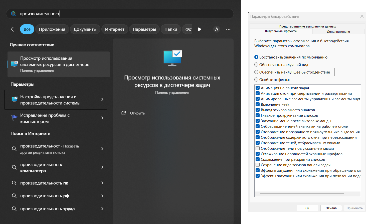 Сама функция располагается в настройках Windows. Чтобы найти ее, можно ввести в поисковой строке запрос «производительность» и найти пункт «Настройка внешнего вида и производительности Windows» или «Настройка представления и производительности Windows».