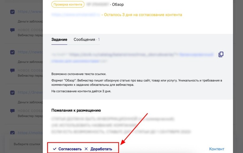 Как только вебмастер передаст контент на утверждение, вам станут доступны кнопки «Согласовать» и «Доработать»: