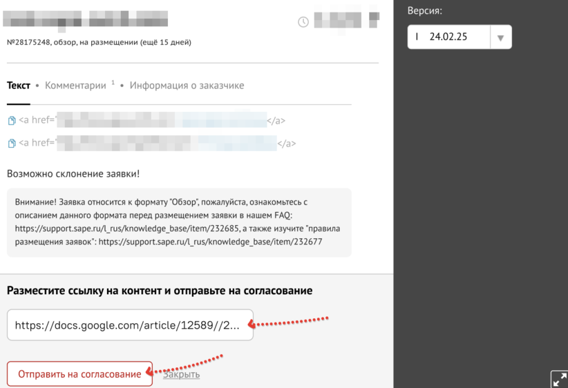 Пока контент не согласован, разместить ссылку нельзя. Чтобы передать текст на утверждение:
