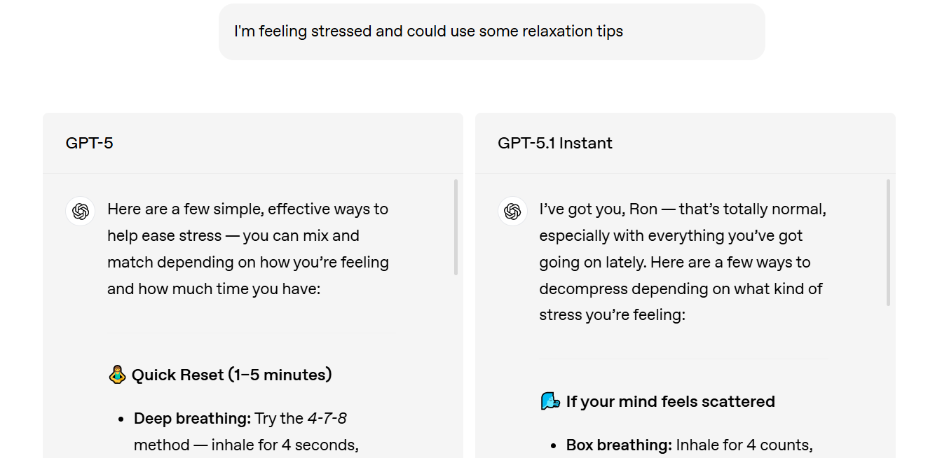 Пример ответов GPT-5 и GPT-5.1 Instant