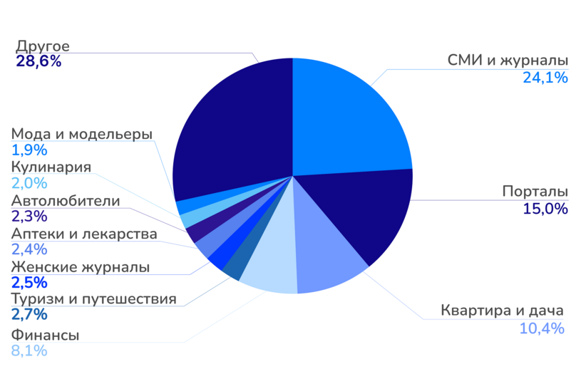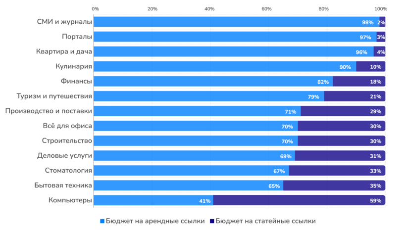 В ряде тематик – таких как СМИ, порталы, квартира и дача, кулинария – на аренду уходит 90% бюджета, поскольку они помогают охватывать широкий пул поисковых запросов. Вечные ссылки особенно востребованы там, где критично доверие – «Компьютеры», «Стоматология», «Бытовая техника», «Деловые услуги» – и используются для усиления ключевых страниц:
