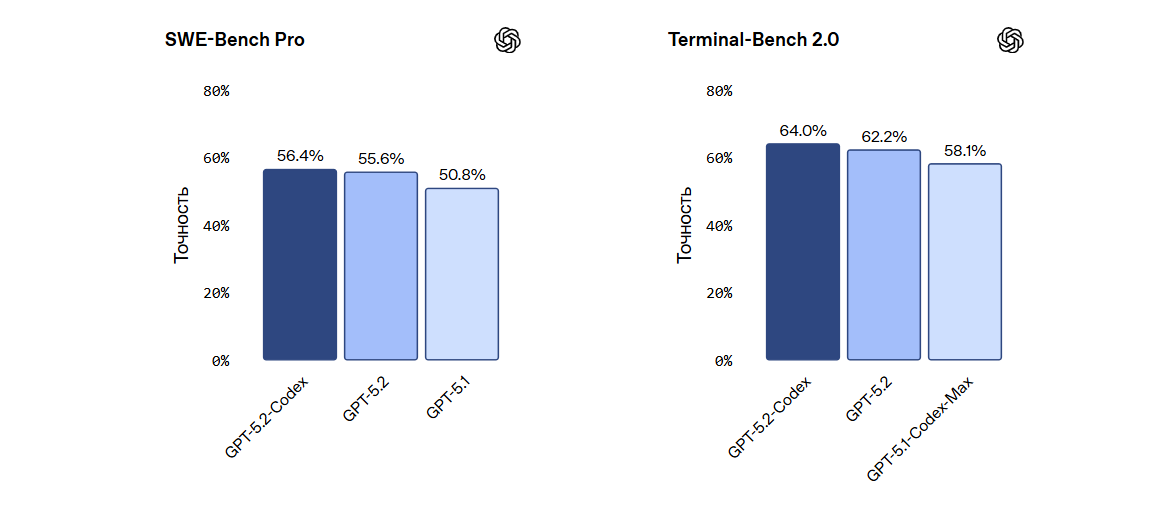 OpenAI подчеркивает усиленные возможности модели в сфере кибербезопасности. GPT-5.2-Codex обошла все предыдущие модели компании при анализе уязвимостей и выполнении задач Capture-the-Flag. В тестах SWE-Bench Pro и Terminal-Bench 2.0 модель улучшила показатели по сравнению с GPT-5.1-Codex.