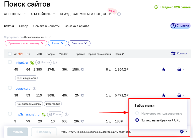 - «Только на выбранный URL» — дает полный контроль над размещением. Пользователь самостоятельно указывает, на каком именно ресурсе должна появиться статья. Это особенно полезно, когда необходимо закрепиться на конкретных проверенных площадках или отработать точечную стратегию продвижения.
