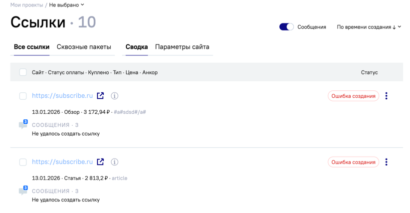 Если на каком-то этапе размещения статьи возникает проблема, ссылка больше не остается в подвешенном состоянии, как это бывало раньше. В случае сбоя она автоматически получает статус «Ошибка создания». Пользователь сразу видит, что с размещением возникли сложности, и может оперативно отреагировать. Достаточно нескольких кликов, чтобы пересоздать ссылку или удалить ее.