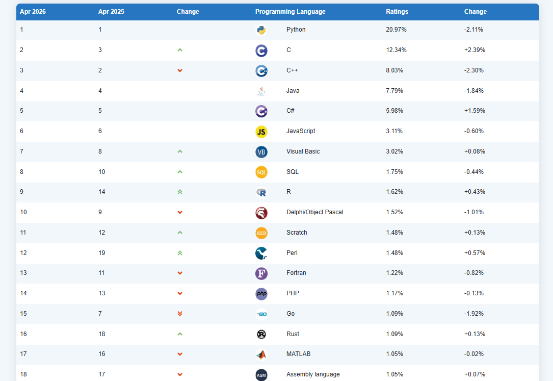 Опубликован рейтинг популярности языков программирования от TIOBE Index за апрель 2026 года. Несмотря на сохранение лидера, в первой десятке произошли изменения, и динамика языков оказалась неоднозначной.
