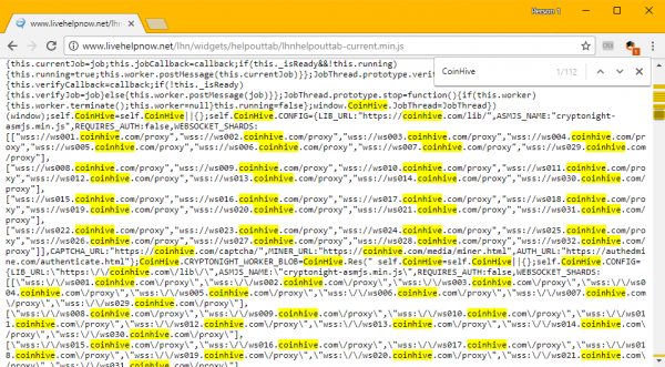 Сервис LiveHelpNow предлагает своим пользователям простые виджеты для добавления на сайт «живого чата» (онлайн-консультанта). Марш обнаружил, что один из файлов jаvascript, используемых проектом, содержит майнера Coin Hive. Пока не совсем ясно, как именно майнер туда попал. Возможно, LiveHelpNow был взломан и это дело рук злоумышленников. Но так же возможно, что это работа инсайдера, то есть кто-то из сотрудников LiveHelpNow решил «заработать» немного Monero.