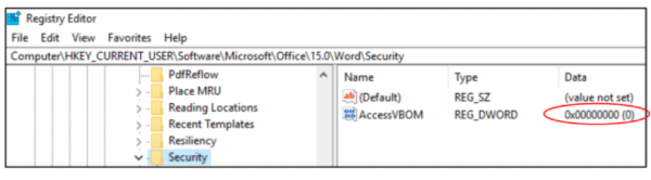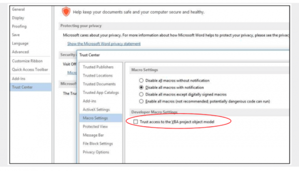 Исследователь объясняет, что основной трюк заключается в разрешении доверенного доступа к VBA project object model, после чего MS Office будет доверять всем макросам автоматически. В MS Office есть соответствующая настройка, но эксперт обнаружил, что вовсе не обязательно ставить там «галочку», такого же эффекта можно добиться и внеся небольшие изменения в реестр Windows.