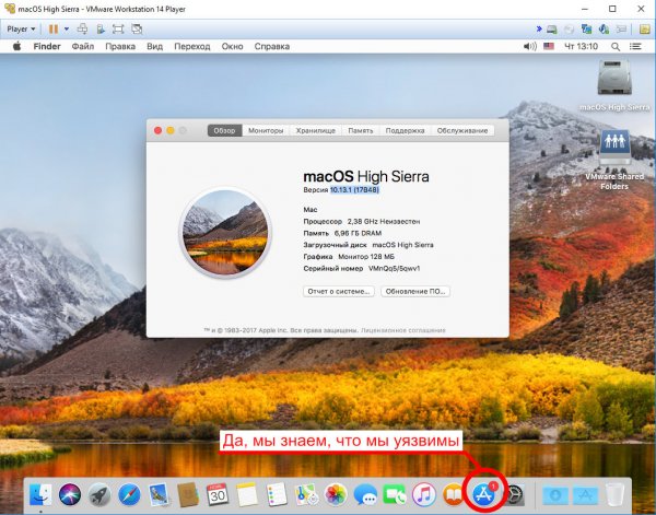 Уязвимая версия macOS High Sierra 10.13.1, работающая под VMware