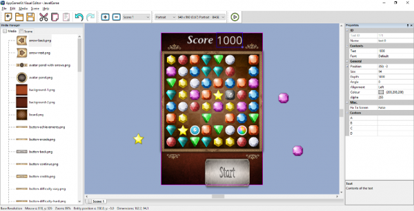 Игра может состоять из нескольких сцен (например, главное меню, игровое поле, экран победы, экран поражения), и все они могут настраиваться в редакторе. Могут быть использованы текстовые поля, точки привязки, создание анимации и прочее.