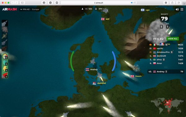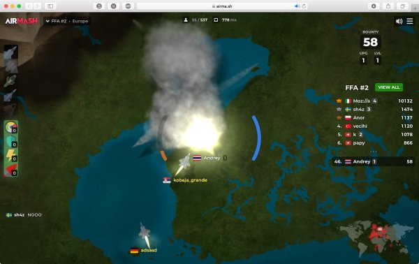 В Airmash тебе первым делом предлагают ввести имя, выбрать один из трех регионов (обычно чем ближе сервер, тем меньше лаг) и режим игры: все против всех, захват флага или «царь горы». После этого ты оказываешься за штурвалом истребителя и должен начинать уворачиваться от вражеских ракет и пускать свои одну за другой.