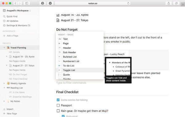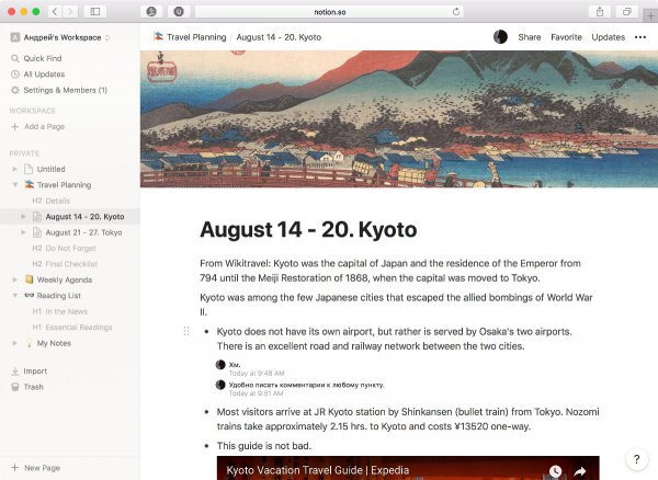 Приложений и сервисов для ведения заметок — не счесть. Однако способы работы, специфические нужды и требования у каждого пользователя тоже свои. Для кого-то важно мобильное приложение, для кого-то — совместное редактирование, для кого-то — возможность добавлять к заметкам разные списки и чек-листы. Ну а кому-то подавай всё сразу. Сервис Notion включает в себя все вышеперечисленное. Заметки здесь хранятся в виде древовидной структуры, где каждая папка также является страницей, на которую автоматически добавляются ссылки на заметки, лежащие внутри. Notion отличается богатыми возможностями по оформлению страниц: можно выбрать шаблон, поставить заглавную картинку, добавить к заметке картинки и видео и так далее. К редактированию легко пригласить коллег и в случае надобности — опубликовать отдельные заметки в виде веб-страниц, чтобы к ним был доступ без авторизации. К каждой странице или даже к отдельному элементу можно добавить комментарий. Все это делает Notion интересным выбором для ведения документации в небольших командах. Напоследок — небольшая хитрость, которая касается авторизации. Зарегистрироваться можно через почту или аккаунт Google. Во втором случае Notion запросит доступ к контактам, но если отказаться, то будет предложено войти без этого. Увы, этот танец потом придется повторять каждый раз. Источник новости - google.com
