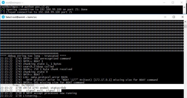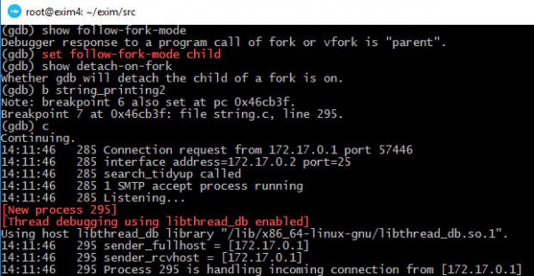 Также нелишним будет вооружиться отладчиком gdb, чтобы контролировать процесс выполнения приложения. В самом отладчике нужно выполнить команду set follow-fork-mode child, потому что Exim запускается в режиме?демона, а при подключении клиента он создает отдельный форк для обработки соединения. Эта опция поможет переключиться на новоиспеченный процесс.