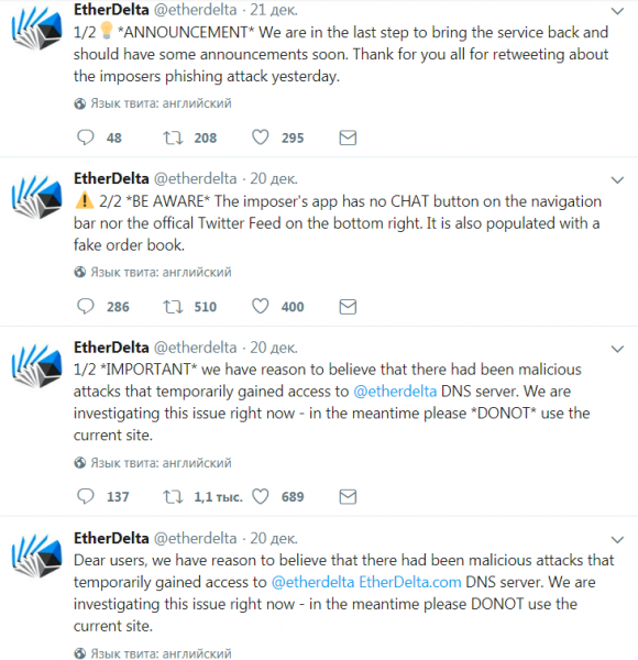 Сегодня, 22 декабря 2017 года, официальный твиттер проекта сообщил, что EtherDelta «вернулась» и заработала в штатном режиме. Разработчики обещают провести серию неких образовательных мероприятий, а также внести изменения в UI/UX, чтобы подготовить пользователей к фишинговых атакам, которые ожидаются в ближайшие недели.