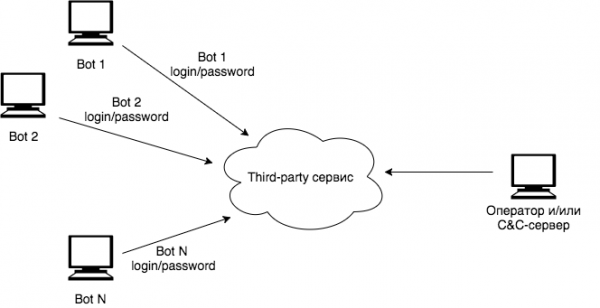 Создание безопасного двустороннего?канала связи с использованием сторонних сервисов — задача нетривиальная. Если не прибегать к каким-либо хакам, то все, что можно предпринять в таком случае, — это раздать ботам учетные данные, которые те будут использовать для связи с командным?сервером. То есть построить что-то вроде такой схемы.