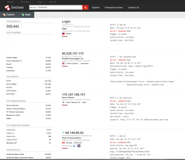 По данным поисковика Shodan, в настоящее время в сети можно обнаружить 500-700 тысяч устройств с уязвимыми версиями GoAhead на борту. И ситуация лишь усугубляется тем, что наряду с отчетом об уязвимости эксперты Elttam опубликовали и proof-of-concept эксплоит.
