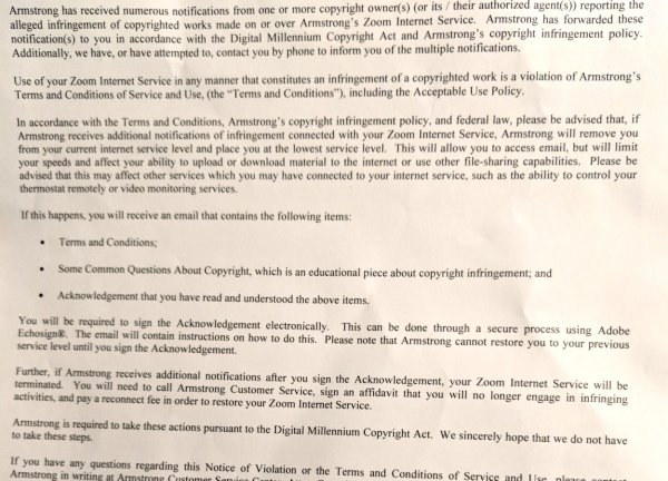 Послание гласит, что если в адрес Armstrong Zoom поступают постоянные жалобы о нарушении авторских прав с одного и того же пользовательского IP-адреса, компания вмешается в ситуацию и принудительно изменит тарифный план нарушителя, понизив уровень обслуживания до самой нижней планки.