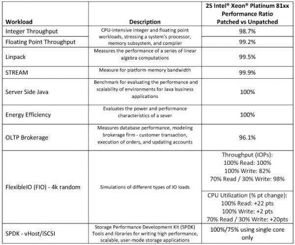 Если ранее компания Inetl уже показывала результаты бенчмарк-тестов и объясняла, как сильно патчи скажутся на домашних пользователях, теперь аналогичные прогнозы были опубликованы и для дата-центров. Как и предполагалось ранее, возможная потеря производительности сильно зависит от конфигурации конкретной системы и тех задач, которые та выполняет. Результаты проведенных тестов можно увидеть в таблице ниже.