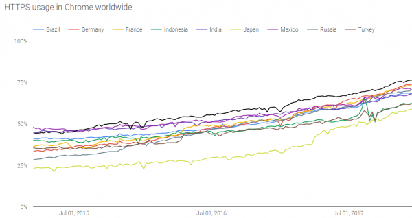 По результатам исследованиям мы видим, что количество использующих шифрование сайтов увеличивается, причем особенно быстрый рост отмечен в последние годы в России. Это полностью подтверждается данными Google.