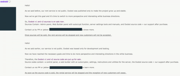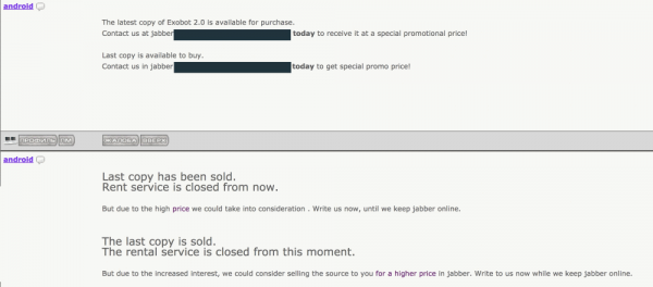 Теперь специалист SfyLabs и журналисты издания Bleeping Computer обнаружили, что автор трояна (известный под псевдонимом android) решил «уйти на покой» и продать исходные коды вредоноса. На скриншотах ниже видно, что android уже объявил о прекращении продаж Exobot по подписке и заявил о готовности продать исходные коды банкера небольшому количеству клиентов.