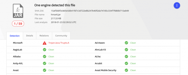 Вордл рассказывает, что на момент написания материала, только 1 из 58 популярных антивирусных решений сумело обнаружить CrossRAT (сейчас таковых насчитывается 25, по данным VirusTotal). При этом изученная версия CrossRAT имела номер 0.1, что заставляет специалистов предположить, что вредонос может находиться на стадии разработки. Этим также может объясняться и пока неактивный кейлоггер.
