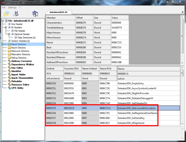 Далее я открыл deleakersdk32.dll в CFF Explorer и зашел в директорию Export. Там нашлись четыре экспортируемые функции с говорящими именами.