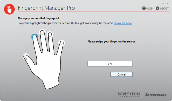 Приложение Fingerprint Manager Pro предназначено для операционных систем Windows 7, 8 и 8.1 и позволяет владельцам устройств Lenovo использовать отпечаток пальца вместо логина и пароля (сами учетные данных хранятся в приложении), осуществляя таким образом вход в ОС или аутентификацию на различных сайтах.