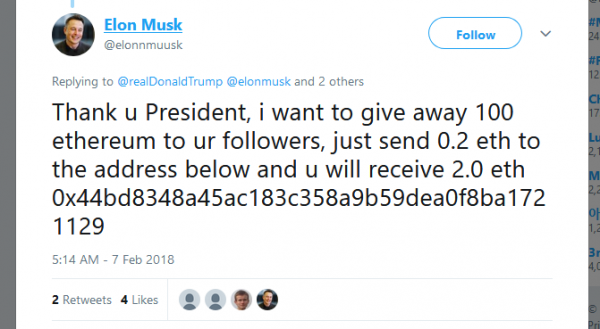 Похоже, что основную часть средств злоумышленники выманили у доверчивых пользователей, выдавая себя за Джона Макафи, Виталика Бутерина и Илона Маска. При этом преступникам изрядно помогла шумиха вокруг состоявшегося 6 февраля 2018 года запуска ракета-носителя Falcon Heavy, в ходе которого в космос отправился автомобиль Tesla Roadster.