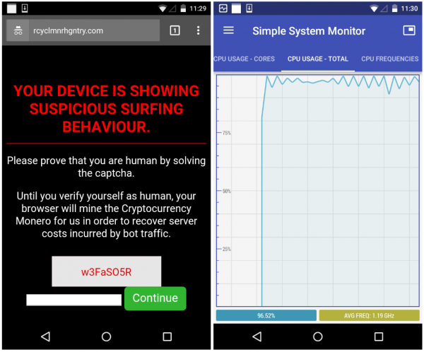 Исследователи пишут, что это вредоносная кампания стартовала еще в ноябре 2017 года. На криптоджекинговые сайты пользователи Android-устройств попадают «благодаря» вредоносной рекламе и редиректам. Тогда как пользователей десктопных решений в таких случаях перенаправляют, к примеру, на сайты фальшивой технической поддержки, пользователям мобильных девайсов предлагают решить CAPTCHA для продолжения работы.