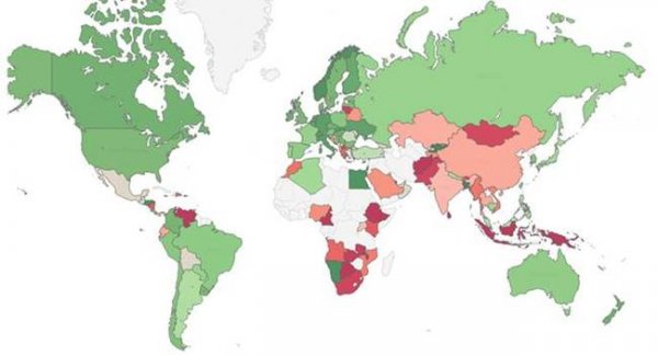 Специалисты Check Point отметили на карте уровень киберугроз по странам (зеленый — низкий уровень риска; красный — высокий; белый — недостаточно данных)