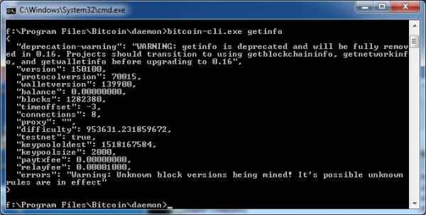 Чтобы проверить настройки, можно воспользоваться готовым клиентом bitcoin-cli. Например, выполнив команду getinfo (предварительно запустив bitcoind). Подробное описание всех команд можно посмотреть тут.