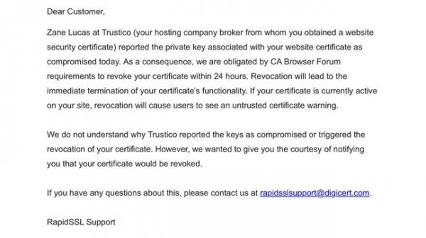 Неприятный и странный скандал развернулся в первых числах марта 2018 года между реселлером сертификатов Trustico и удостоверяющим центром DigiCert. В результате, 1 марта 2018 года, неожиданно были отозваны более 23 000 SSL-сертификатов Trustico, и сейчас многие эксперты говорят о том, что случившееся может иметь последствия для всей индустрии в целом.
