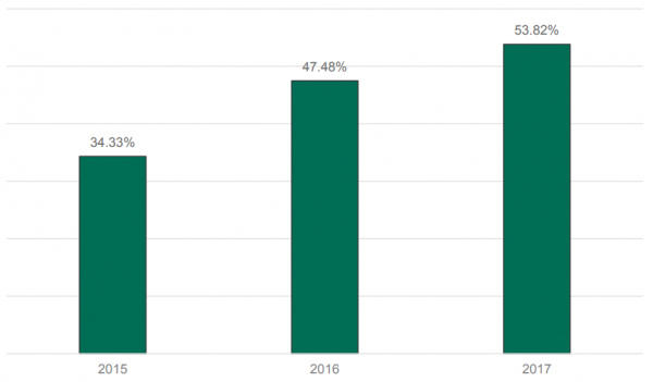 В целом доля финансового фишинга в 2017 году достигла рекордного уровня. Аналитики сообщают, что 54% всех фишинговых атак пришлось на различные сайты, так или иначе связанные с финансовыми услугами: банки, платежные системы, интернет-магазины и так далее. Годом ранее этот показатель составлял 48%, а еще раньше, в 2015 году, – 34%.