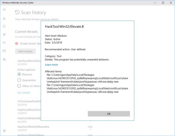 К сожалению, разработчики Microsoft, похоже, не учли особенностей Kali Linux и забыли, для чего тот предназначен. В результате Windows Defender обнаруживает эксплоиты и хакерские инструменты и видит в дистрибутиве и его пакетах угрозу.