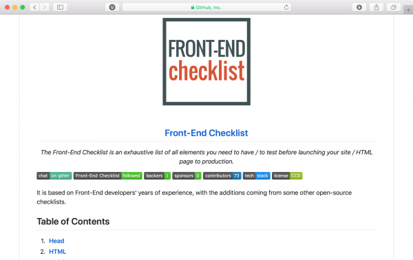 Если попытаться записать всё, что нужно добавить, подключить и проконтролировать перед тем, как открывать сайт, то выйдет внушительный список. Именно его составлением и занялся куратор документа под названием Front-End Checklist и опубликовал свою подборку на Github во имя всеобщего блага.