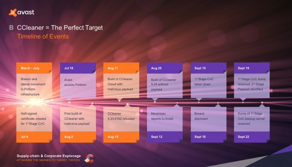 Теперь, спустя полгода после инцидента, представители компании Avast, которой принадлежит CCleaner и разработавшая его компания Piriform, выступили с докладом на конференции Kaspersky Security Analyst Summit. Аналитики Avast рассказали, что их собственное расследование случившегося обнаружило на четырех машинах сотрудников Piriform малварь ShadowPad, заражение которой произошло еще в марте-апреле 2017 года. То есть компрометация произошла еще до того, как компания Avast приобрела Piriform.