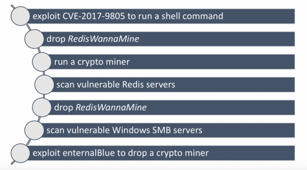 Первую вредоносную кампанию заметили эксперты Imperva и присвоили ей название RedisWannaMine. По данным специалистов, злоумышленники активно ищут в сети уязвимые и давно не обновлявшиеся серверы Redis, после чего атакуют их, используя эксплоит для уязвимости CVE-2017-9805. Если компрометация сервера удалась, хакеры устанавливают на устройство майнера ReddisWannaMine.
