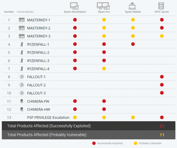 На официальном сайте, посвященном проблемам в процессорах AMD Ryzen и EPYC, аналитики CTS-Labs рассказывают, что им удалось обнаружить сразу 13 критических уязвимостей (стоит заметить, что CVE исследователи не приводят), которые были разделены на четыре класса: RyzenFall, MasterKey, Fallout и Chimera. Исследователи уверяют, что при помощи этих брешей злоумышленники могут установить полный контроль над уязвимой системой, а также извлекать данные из защищенных областей, равно как и в случае с Meltdown и Spectre.