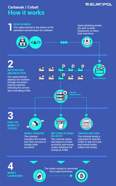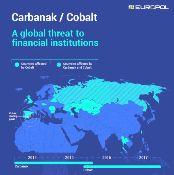 По данным правоохранителей и ИБ-экспертов, хакерская группа активна как минимум с 2013 года. Все это время хакеры атаковали банкоматы и финансовые учреждения в разных странах мира, начав с малварь-кампании Anunak (2013-2-14 годы), после перейдя на ее улучшенную версию Carbanak (2014-2016 годы), а затем создав еще более сложного вредоноса, известного как Cobalt Strike (2016-2017 годы).