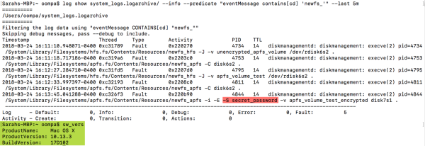 В итоге любой желающий может узнать пароли от зашифрованных томов пользователя при помощи команды в терминале: log stream —info —predicate ‘eventMessage contains «newfs_»‘.