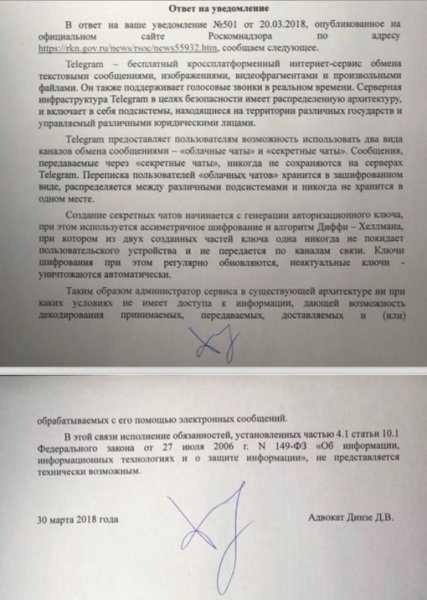 Копию направленного в Роскомнадзор письма можно увидеть ниже. В нем юристы Telegram Messenger LLP объясняют, что Telegram обладает распределенной инфраструктурой, подсистемы мессенджера управляются различными юридическими лицами и рассредоточены по разным странам мира. Также юристы напоминают, что «секретные чаты» Telegram не сохраняются на серверах компании, а обычные чаты, названные в послании «облачными», шифруются и хранятся распределено.